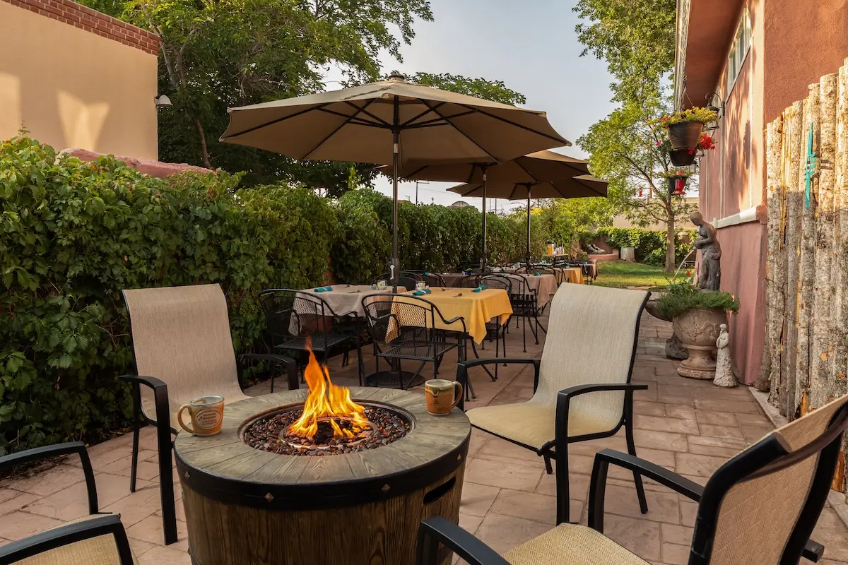 Natural light fills the room in summer, with windows on three sides and airy curtains for just the right amount of privacy. After a day exploring Old Town Albuquerque, retreat to your generous private bathroom, where an oversize tub with shower offers a soothing place to unwind. Whether you’re planning a romantic New Mexico getaway or celebrating a special anniversary, this is a space designed to help you relax, recharge, and make memories.